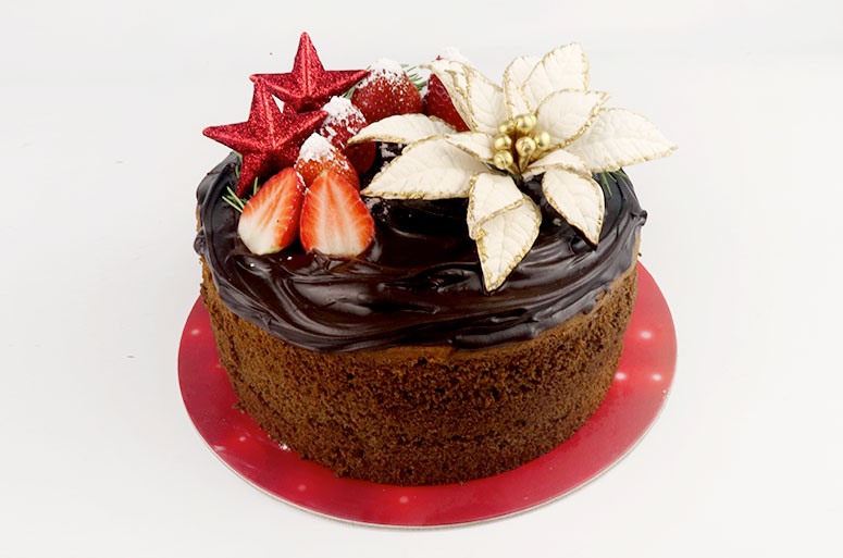Buka kue dari loyang lalu poles dengan coklat filling hias dengan buah strawberry dan pernak pernik natal, sajikan