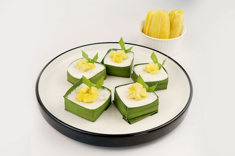 Hias dengan potongan buah mangga dan daun pandan iris, siap disajikan